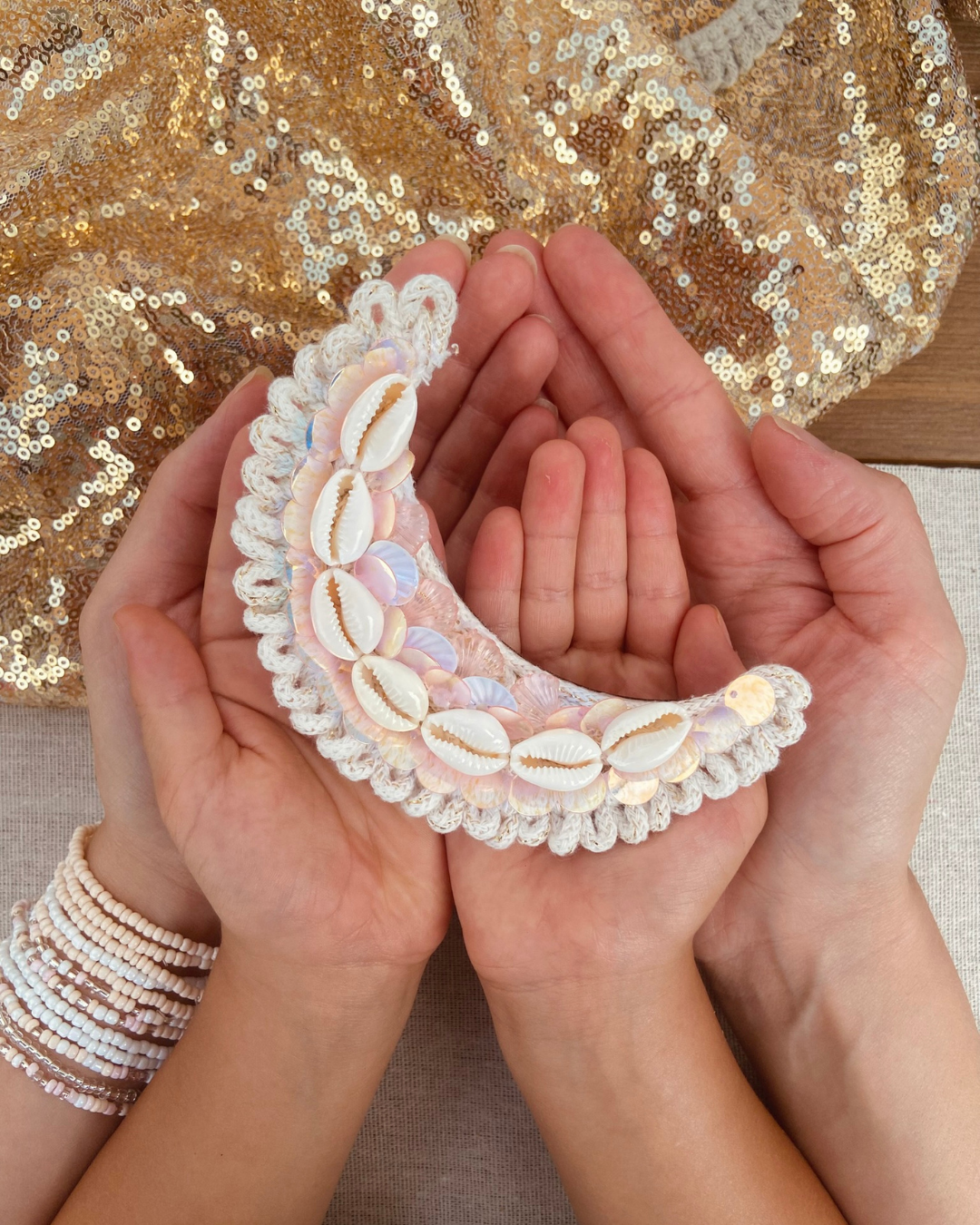 Lune macramé, coquillages et pampilles hologramme - accessoire Bohème